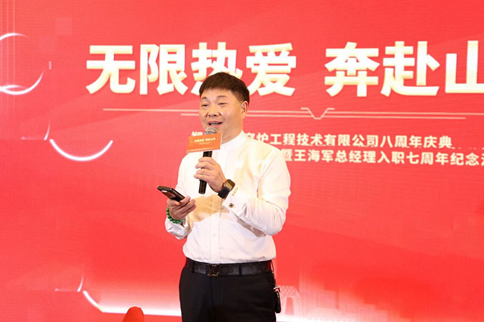 集团董事长楚科奇首先发表了致辞。他回顾了荣盛窑炉工程八年来从创业维艰到行业头部的奋斗历程。他指出,每一份成绩的取得,都凝聚着全体员工的智慧、汗水与“无限热爱”。楚总向入职七周年的王海军总经理表达敬意与感谢,高度评价,拥有 领导力和市场洞察力。他特别强调,在王总的带领下,工程公司今年业绩超越预期,创下历史新高,为公司树立了新的发展标杆。同时,楚总也对朱广州带领的工程项目部、白建伟负责的生产部以及集团管理层表达了充分肯定,感谢各团队为公司发展作出的重要贡献。最后,楚总号召全体荣盛人,以八周年为新的起跑线,凭借对事业的无限热爱与坚定信念,共同驱动荣盛巨轮,在时代的浪潮中破浪前行,开辟更加壮丽的征途。